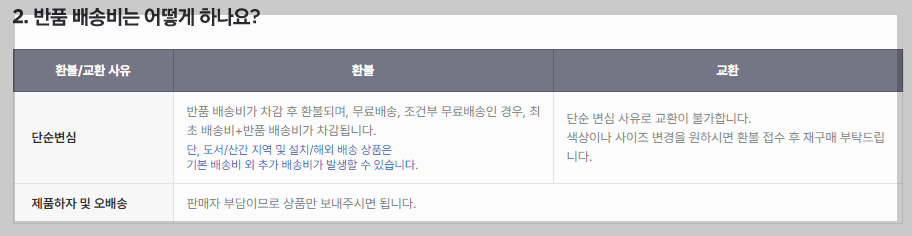 | 단순변심 | ✅ 반품 배송비가 차감 후 환불되며, 무료배송, 조건부 무료배송인 경우, 최초 배송비 + 반품 배송비가 차감됩니다. ✅ 단, 도서/산간 지역 및 설치/해외 배송 상품은 기본 배송비 외 추가 배송비가 나옵니다. |